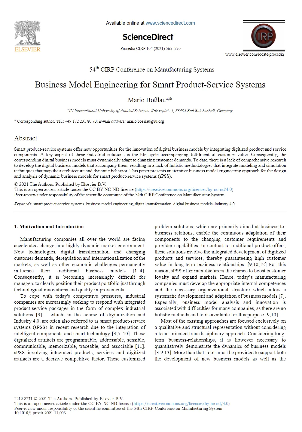 Das Aufkommen intelligenter digitaler Produkte und Dienstleistungen eröffnet neue Möglichkeiten für die Innovation von Geschäftsmodellen. Smarte Produkt-Service-Systeme integrieren digitalisierte Komponenten, um ein nahtloses Kundenerlebnis zu bieten, das sich dynamisch an die sich ändernden Anforderungen der Kunden anpasst. Derzeit gibt es noch keine umfassenden Methoden zur Entwicklung solcher ganzheitlicher digitaler Systeme, die die Dynamik und Struktur der damit einhergehenden Geschäftsmodelle berücksichtigen. In unserem Beitrag werden wir einige wichtige Überlegungen für die Entwicklung von Geschäftsmodellen in smarten Produkt-Service-Systemen untersuchen. Zunächst werden die verschiedenen Arten von Geschäftsmodellen erörtert, die in diesen Systemen zum Einsatz kommen können, gefolgt von einer Diskussion zur systematischen, IT-gestützten Geschäftsmodellentwicklung. Den Artikel können Sie herunterladen, indem Sie auf das folgende Bild klicken. Wenn Sie noch mehr darüber erfahren möchten, können Sie uns auch gerne kontaktieren!